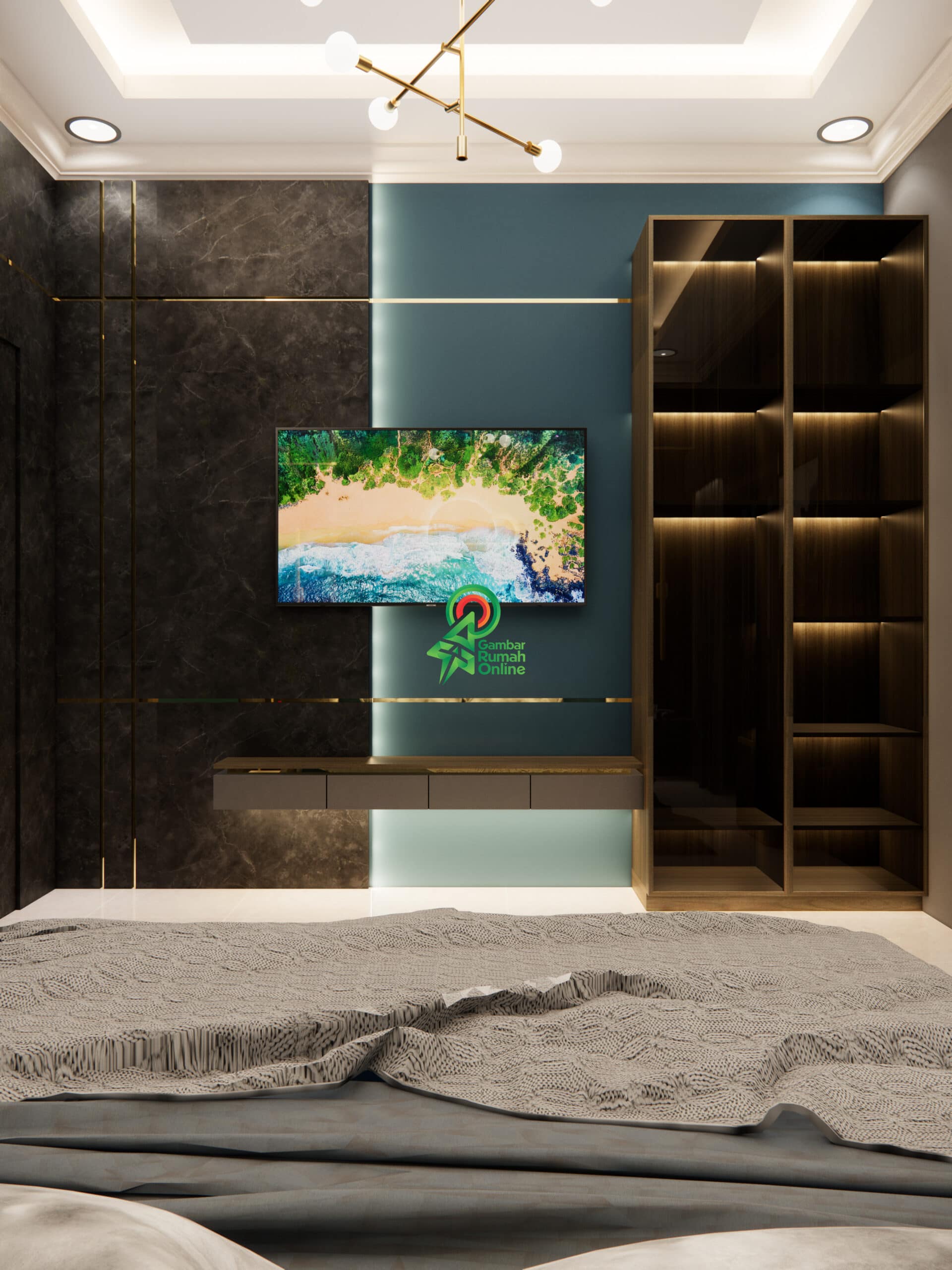 Desain kamar utama minimalis modern ini menghadirkan suasana tenang, elegan, dan berkelas, sangat ideal untuk hunian masa kini. Dominasi panel dinding bertekstur lembut dengan warna biru gelap dipadukan aksen marmer serta garis emas memberikan kesan premium namun tetap minimalis.