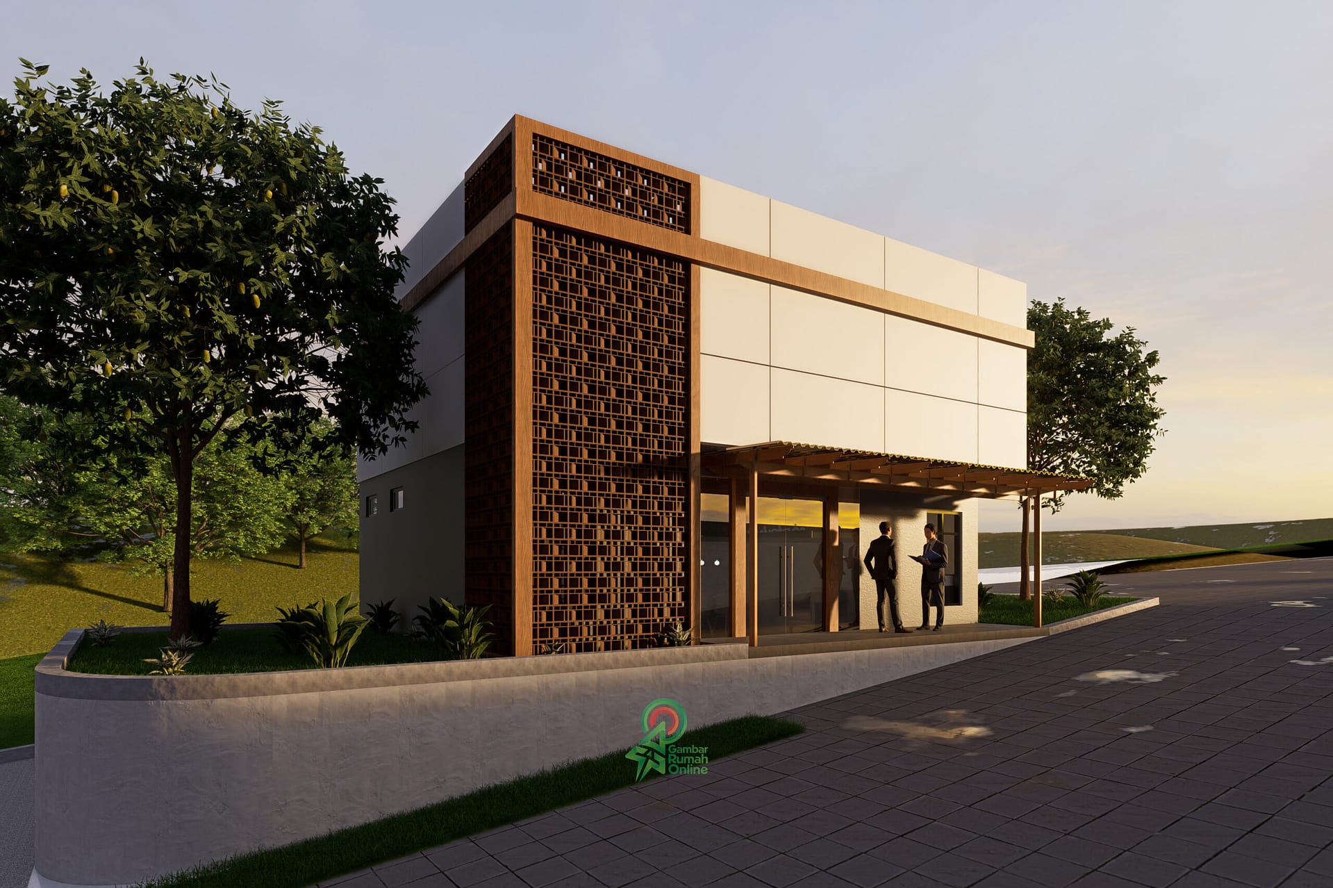 Desain kantor modern kontemporer seperti ini sangat cocok untuk perusahaan, institusi, maupun manajemen properti yang ingin memiliki bangunan dengan tampilan modern, kredibel, dan sesuai dengan perkembangan arsitektur saat ini.